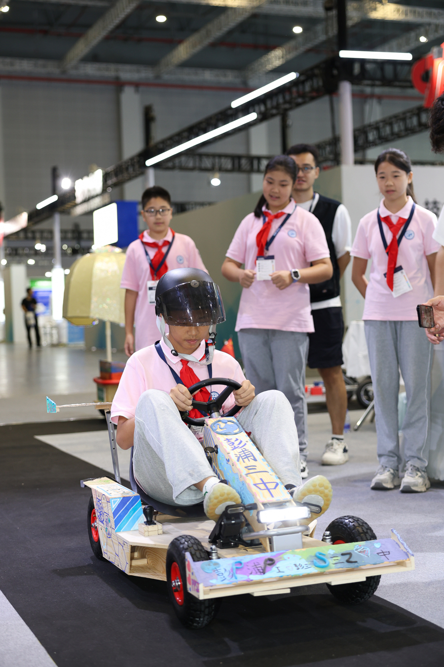三辆纯手工打造的卡丁车,由梦想驱动,分别来自上海市第一师范学校附属小学、彭浦第三中学和市西中学。从车架到尾翼,每一个部件,均由学生们利用基础材料,从零开始,亲手切割、打磨、组装而成。静安区教育学院附属学校的学生用两节 5 号电池,驱动了一辆“轻量化”未来概念太空车模型。齿轮组带动特制圆缺形轮胎,不仅能平坦路面平稳前行,还能有效应对坡道地形,顺畅爬坡。大宁国际小学的同学们则通过编程指令泛策略,在地图赛道上出色实现了自主巡线与精准避障,这是他们在学校机器人课程的成果。