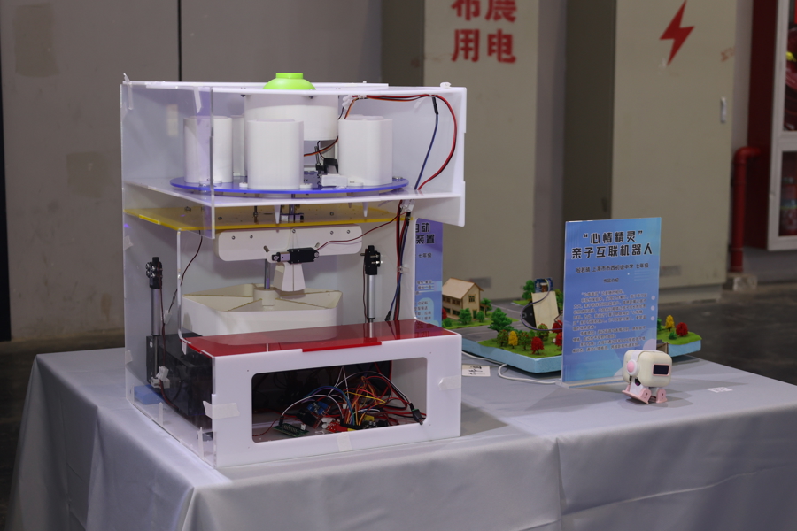 市西初级中学男生金嘉诚喜欢吃火锅,打卡热门火锅店后,琢磨出一个新问题——高峰期去火锅店,单份蘸料调配耗时在2分钟左右,调料台前有时候就容易排队;想尝试一些新口味,又经常因为不熟悉配比,好好的一碗调料只能白白浪费。在老师指导下,他的“自动调配火锅蘸料机器”应运而生,能响应 “调配川渝经典蘸料”“来一份麻酱蘸料,少腐乳”“不要葱花和香菜” 等个性化语音指令,也能通过上中下三层式协同结构自动调配调料,很多点子来自“小吃货”的生活实践——比如,液体调料瓶采用挤压结构,适配高黏度麻酱;固体调料夹子采用硅胶防滑设计,避免葱花、香菜粘连……